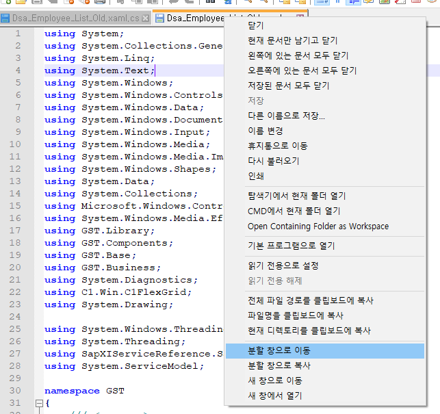 [창 마우스 오른쪽] > [분할 창으로 이동]